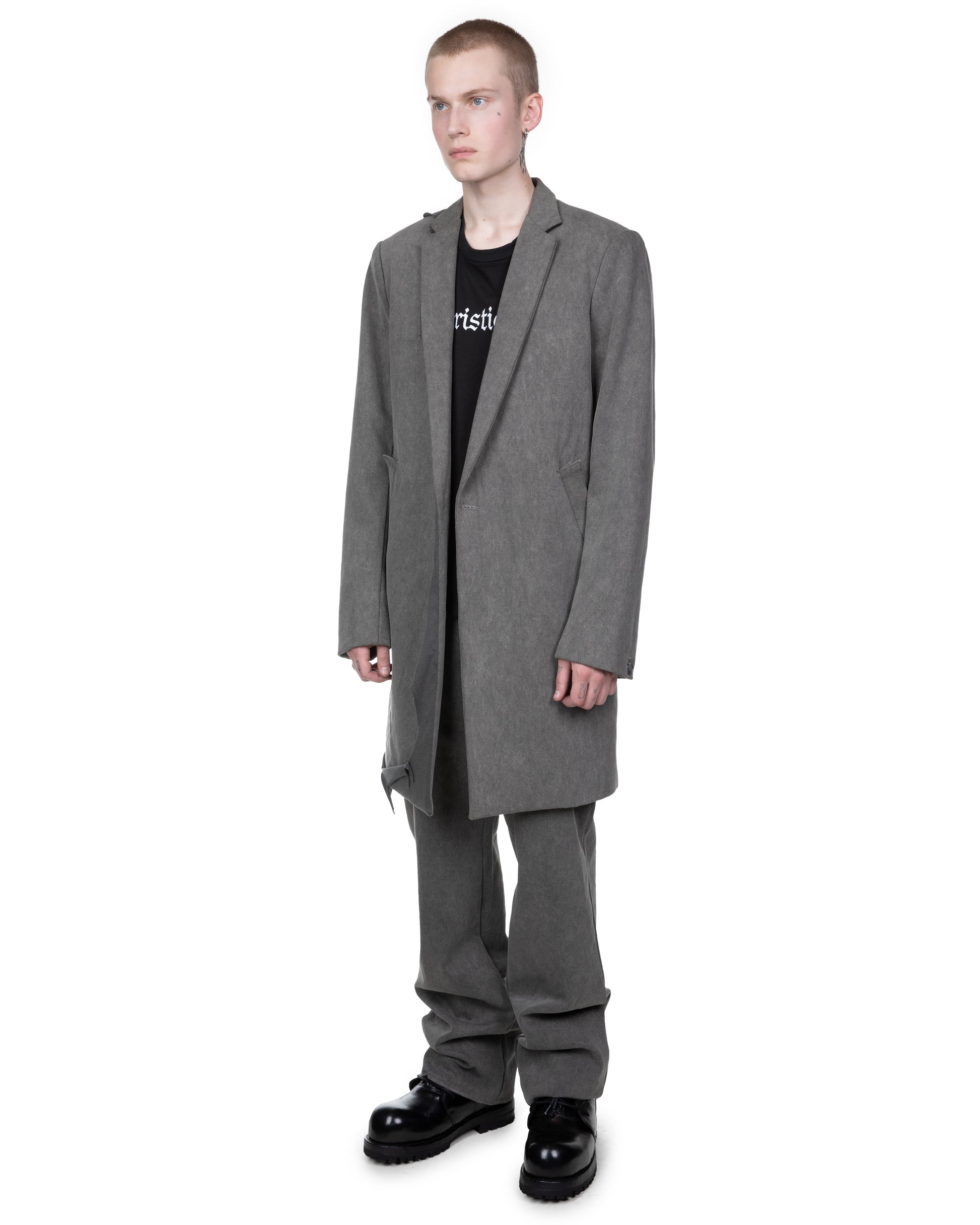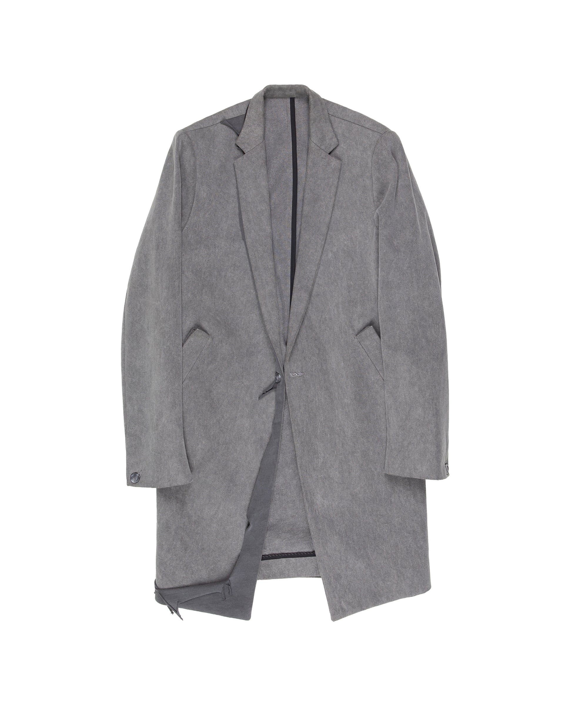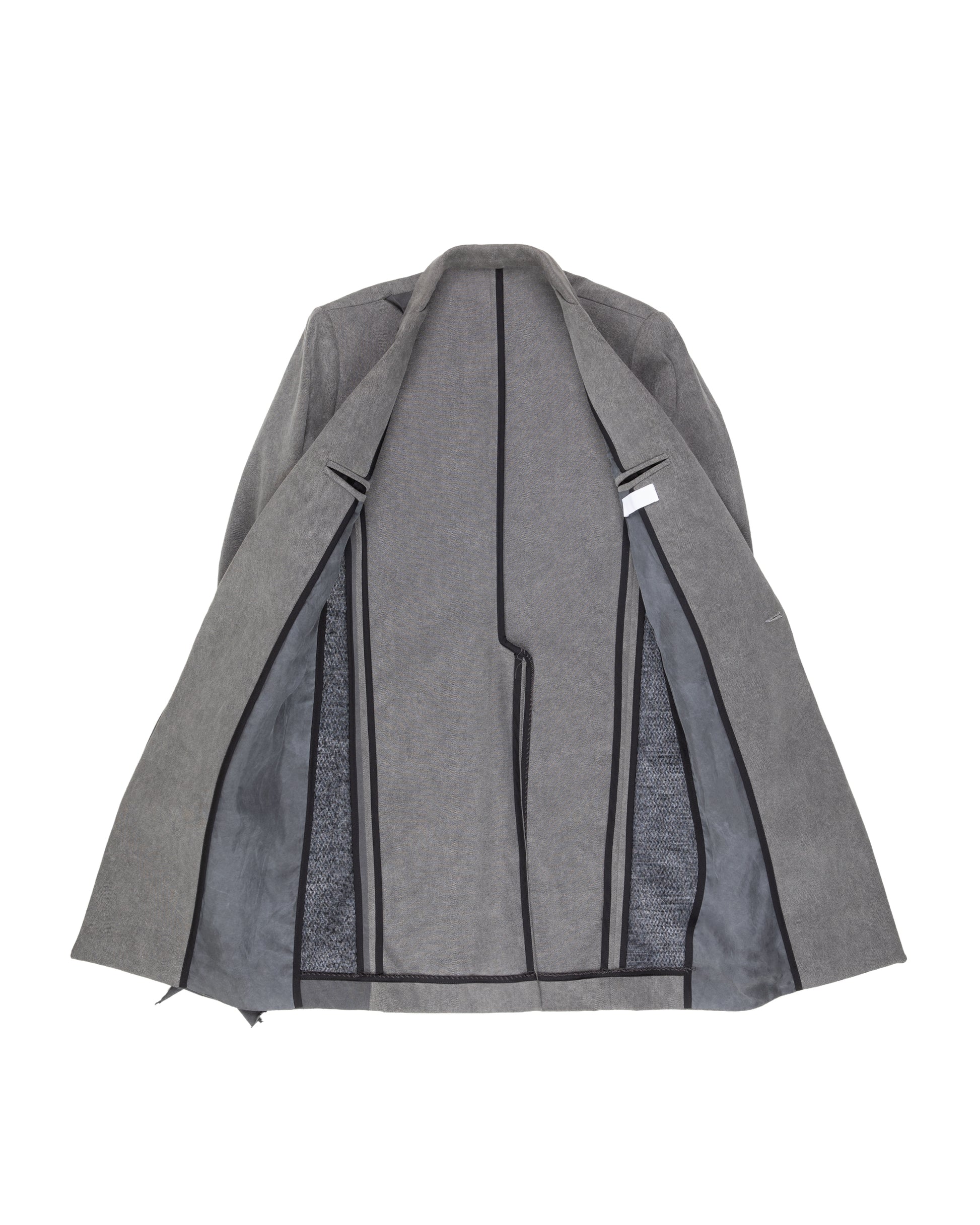 Broken Weave Art Washed Cotton, Art Washed Cupro Lining. Taped Seams Throughout. Shoulder Pads With Artisanal Hand Stitched Construction. Open Welt Flap Pockets.