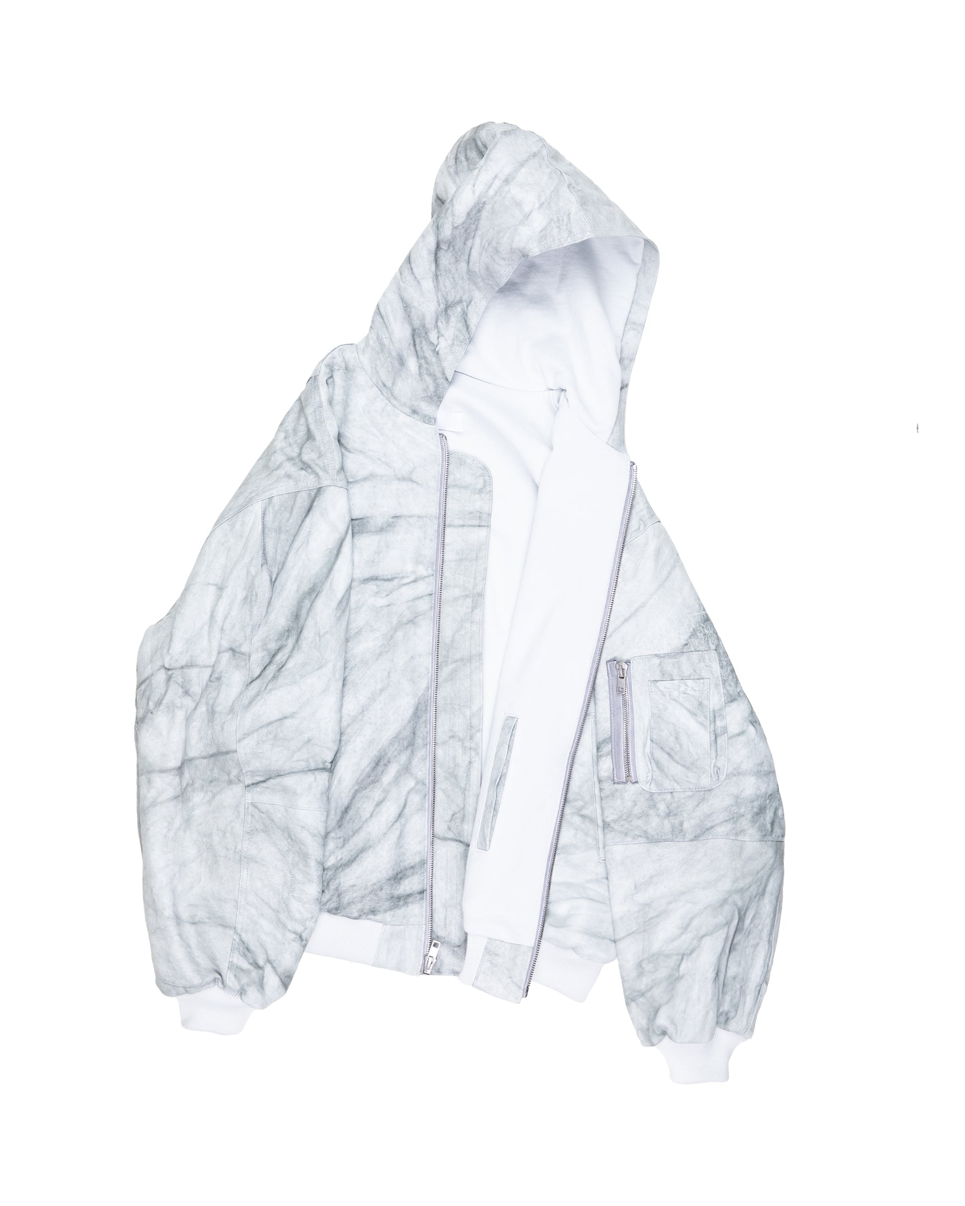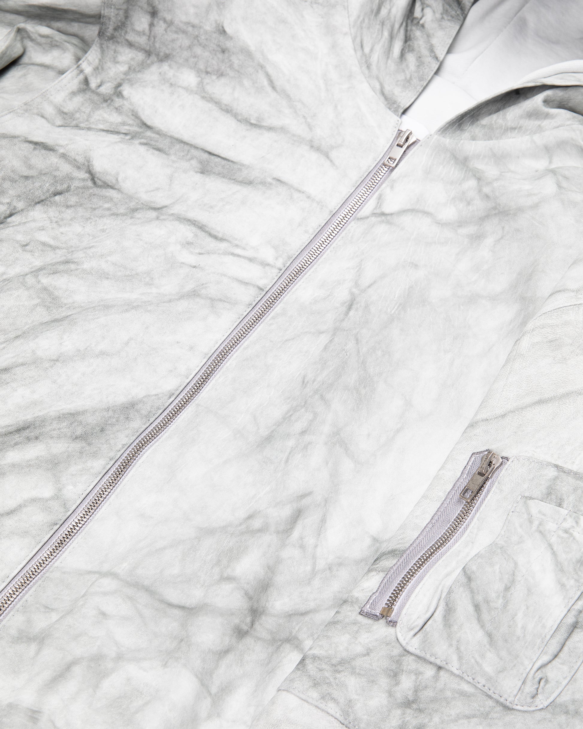 Custom Tanned Art Washed Leather Hides. Fleece Lining, Unique Wash Processing Throughout. Open Flap Welt Pockets, Oversized Fit.